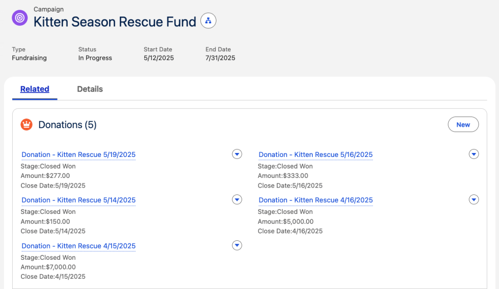 Donations tracked and linked to campaigns for visibility into fundraising performance.