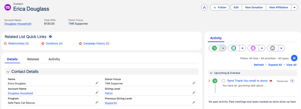Centralized donor profile showing giving level and automated follow-up task creation.