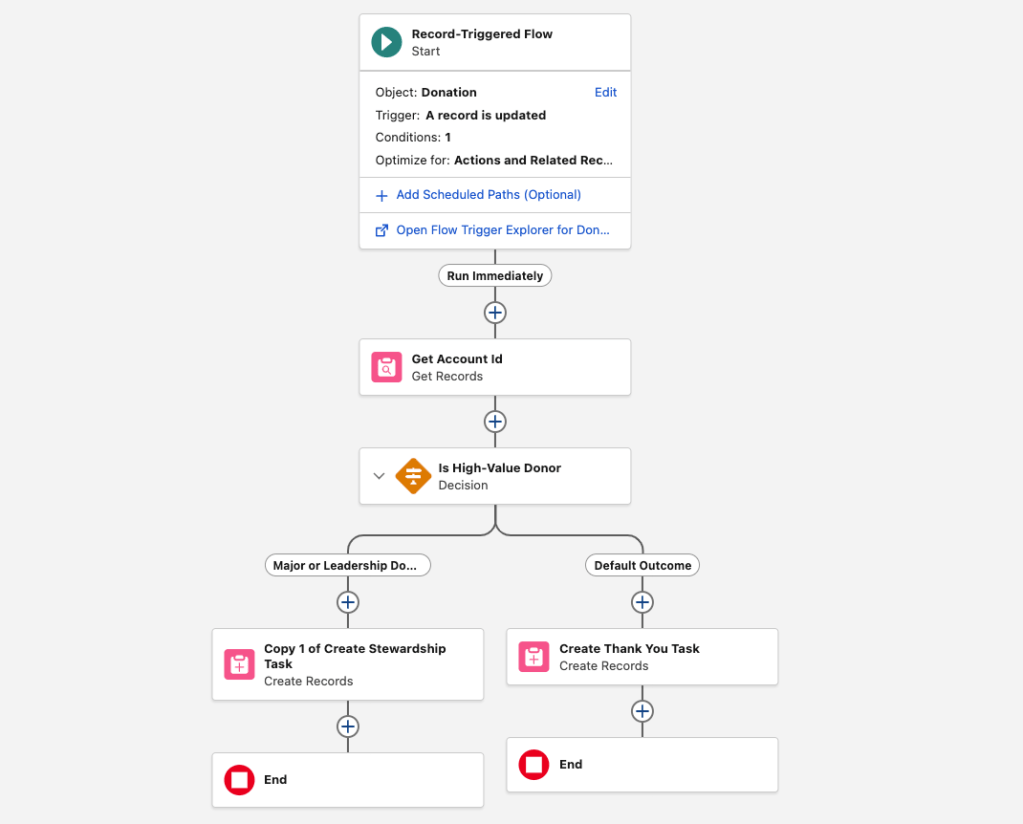 Record-Triggered Flow automates follow-up task creation based on donation data.