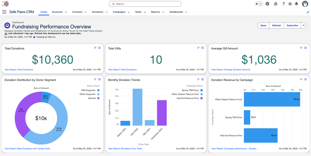 Safe Paws is a nonprofit animal rescue organization focused on supporting and rehoming pets. They needed a centralized way to track donors, manage donations, and associate contributions with fundraising campaigns. Their existing approach lacked visibility into total giving and did not support consistent follow-up with donors, limiting engagement and fundraising effectiveness.