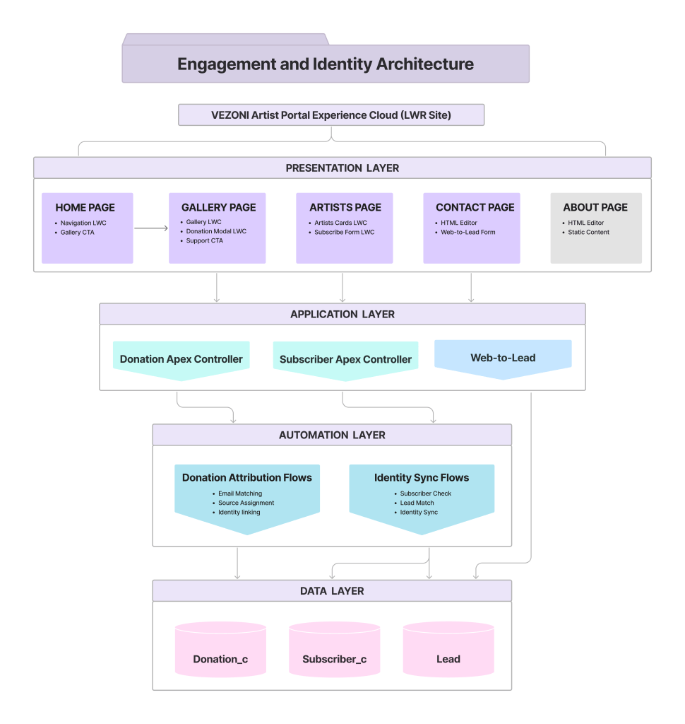 This diagram illustrates the layered architecture of the Vezoni Artist Portal Experience Cloud site, including the presentation, application, automation, and data layers.