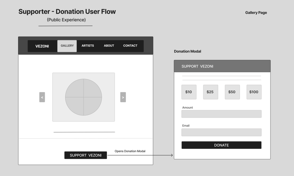 This wireframe shows the Supporter donation flow from gallery interaction to submission. Donations can be made without creating an account while Salesforce records and attributes each contribution.