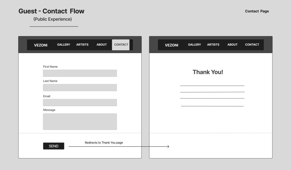 This wireframe shows the Guest contact flow from form submission to confirmation. The form uses Salesforce Web-to-Lead to capture inquiries while keeping the experience simple.