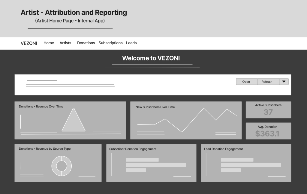 This wireframe shows the Artist dashboard for donation tracking and engagement reporting. A Record-Triggered Flow matches donations to Subscriber or Lead records.