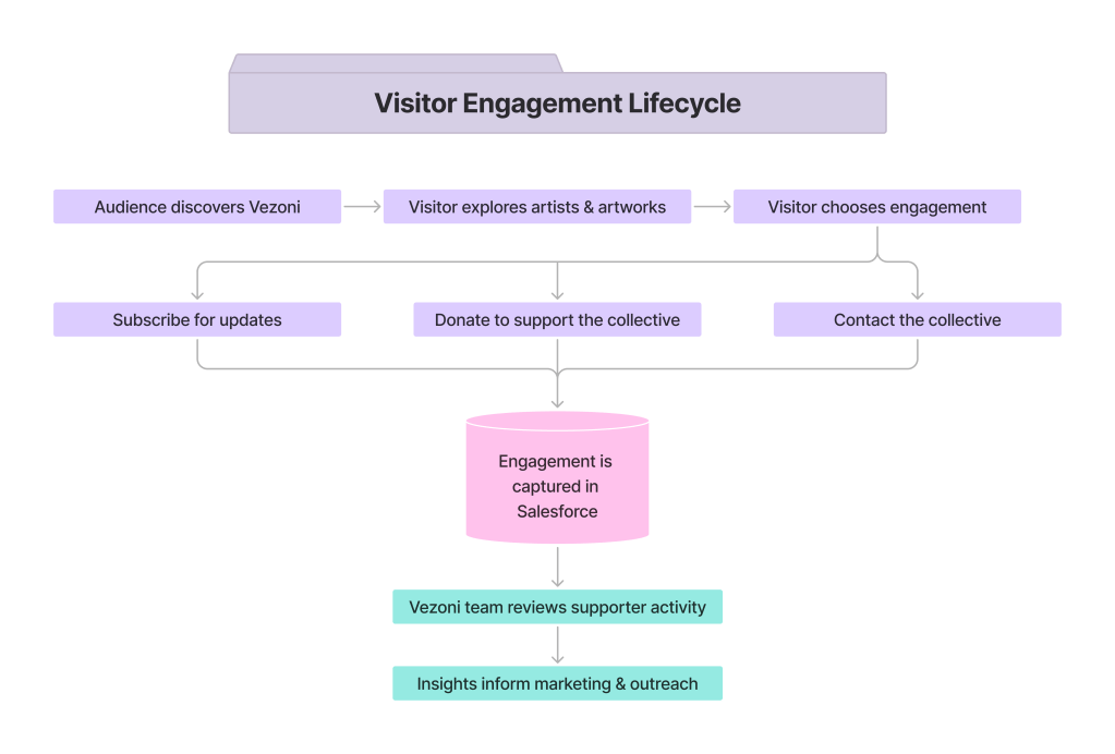 This business process map shows how visitors discover Vezoni, explore the collective’s work, and engage through subscriptions, donations, or inquiries.